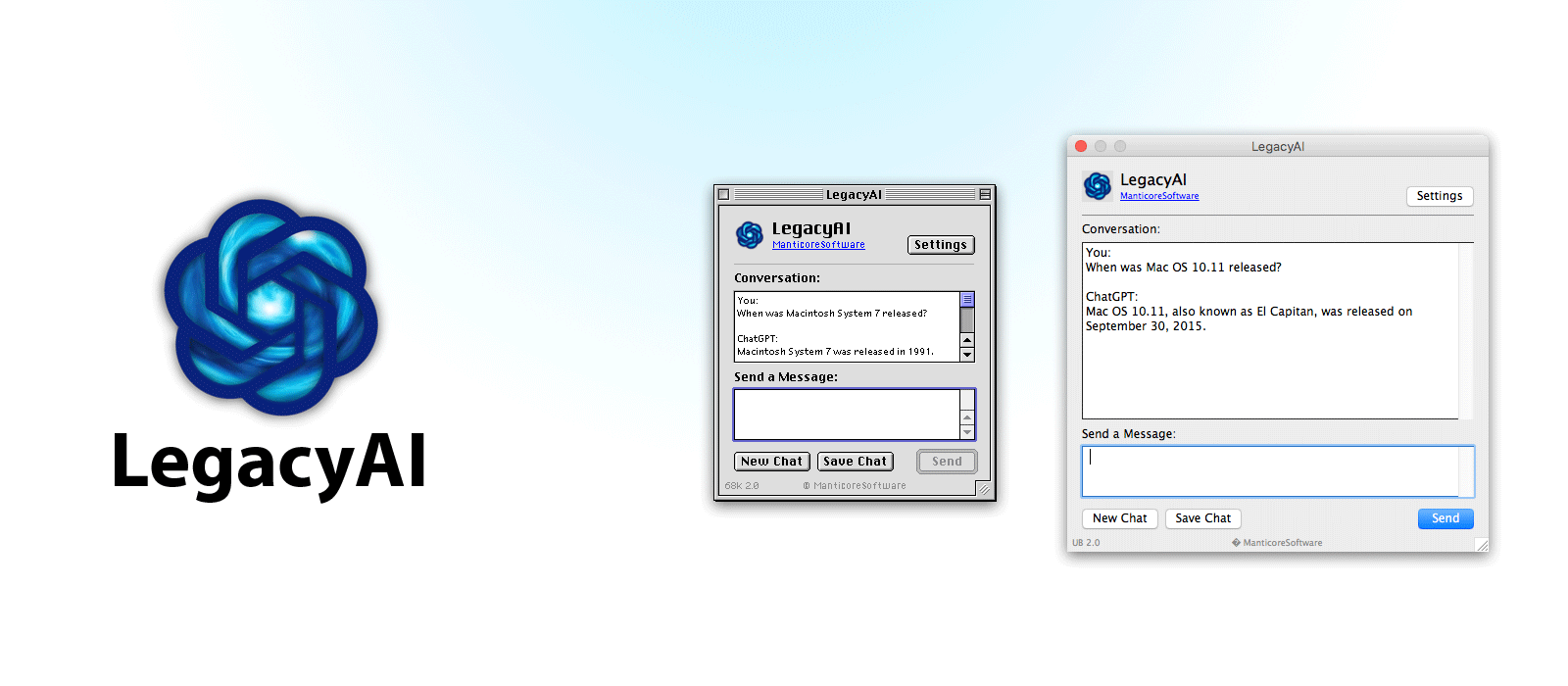 LegacyAI works across 15 different Mac systems, from System 7 to 10.11 (El Capitan). LegacyAI has allowed Macintosh computers from 1988 and onwards to communicate with ChatGPT, even before iOS had an official app for it.